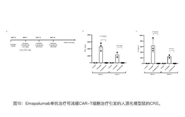- huHSC-NOG-EXL小鼠注射CAR-T細(xì)胞后7天內(nèi)出現(xiàn)死亡,Emapalumab單抗治療的組別小鼠生存情況明顯改善,生存觀察期延長(zhǎng)至15天(圖17)。