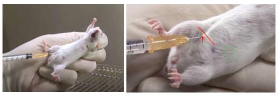 4. Inserting the needle on the mouse's right side avoiding the cecum, which is a large fluid-filled organ on the left side of the abdomen. The small intestines (on the right side) are less likely to be punctured by the needle.
