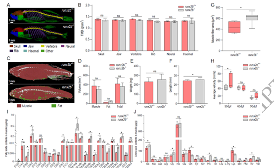 圖4比較runx2b+/+和runx2b−/−斑馬魚(yú)的游動(dòng)性、組織和生長(zhǎng)特征 (A, B) runx2b+/+和runx2b−/−斑馬魚(yú)6種不同骨組織礦物質(zhì)密度(TMD)值。(C, D) runx2b+/+和runx2b−/−斑馬魚(yú)肌肉體積的定量;紅色和綠色區(qū)域分別表示肌肉和脂肪
