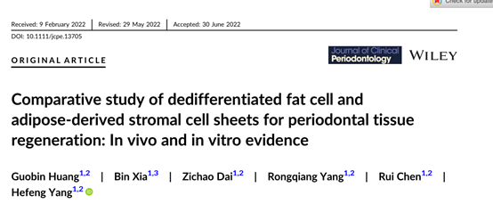 目的:比較脂肪源性去分化脂肪(DFAT)細胞與脂肪間充質干細胞(ADSC)片再生治療牙周缺損的療效。