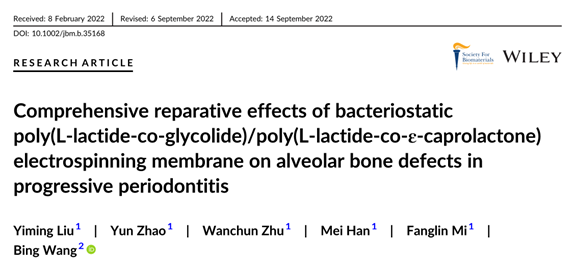 米諾環(huán)素/PLGA/PLCA靜電紡絲膜是一種有前途的GBR材料,可用于牙周炎誘導(dǎo)的牙槽骨損傷的再生。