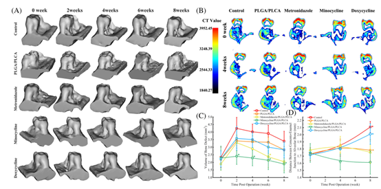 (A)不同膜處理的手術(shù)牙槽骨CT掃描三維重建圖像;(B)牙釉質(zhì)接點之間的距離(每組n = 5);(C) CT三維重建模型得到的牙槽骨缺損體積的統(tǒng)計結(jié)果(每組n = 5, *表示與對照組比較差異顯著,p < .05,統(tǒng)計倍數(shù)>0.9);(D)牙釉質(zhì)連接距離的統(tǒng)計結(jié)果(每組n = 5, *表示與二甲胺四環(huán)素/PLGA/PLCA組比較差異顯著,統(tǒng)計功效>0.9)。PLGA / PLCA,保利(L-lactide-co-glycolide) /聚(L-lactide-coε己內(nèi)酯)。