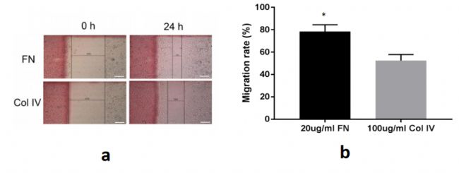 圖3. 20μg/ml FN和100μg/ml COL IV預(yù)包被培養(yǎng)皿對(duì)細(xì)胞遷移的影響[10]