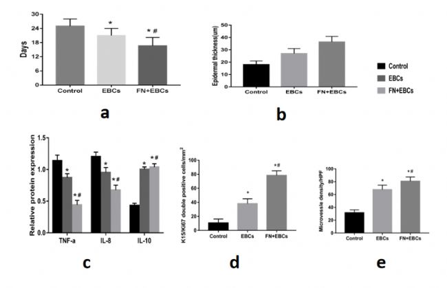 在EBC噴霧之前,在創(chuàng)面床上預(yù)涂FN可通過(guò)提高ESCS的利用效率,促進(jìn)血管生成,減少創(chuàng)面炎癥,調(diào)節(jié)膠原的形成和降解,顯著縮短創(chuàng)面愈合時(shí)間,增加創(chuàng)面愈合表皮厚度。