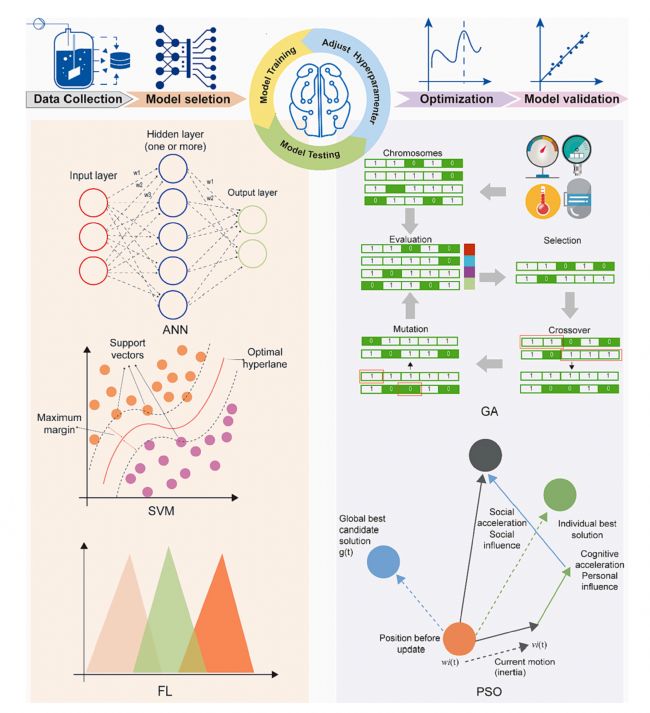 圖 1. 生物過程建模和優(yōu)化程序以及人工神經(jīng)網(wǎng)絡(luò)(ANN)、支持向量機(SVM)、模糊邏輯 (FL)、遺傳算法(GA)和粒子群優(yōu)化(PSO)的示意圖