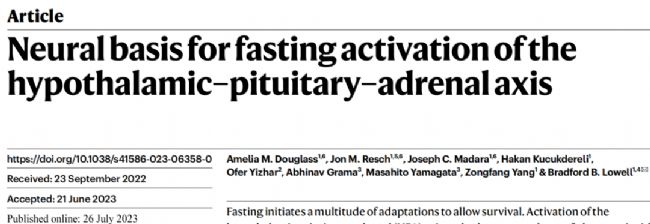 2023年7月26日哈佛醫(yī)學(xué)院貝斯以色列女執(zhí)事醫(yī)療中心Bradford B. Lowell研究團(tuán)隊(duì)在Nature雜志上發(fā)表文章禁食激活下丘腦刺鼠相關(guān)蛋白陽(yáng)性神經(jīng)元,進(jìn)而激活HPA軸,短暫維持能量代謝,避免低血糖反應(yīng)。