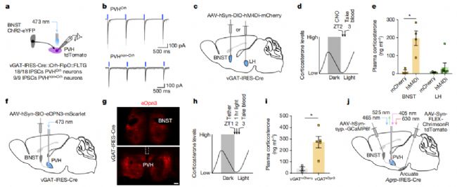 圖3:AgRP神經(jīng)元通過(guò)抑制BNST來(lái)源的軸突末梢激活PVH-Crh神經(jīng)元