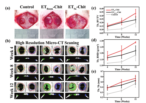所有步驟均獲得華東理工大學(xué)動物研究生物倫理委員會(ECUST-2022-048)批準。采用顱骨缺損模型對18只雄性SD大鼠(8周,平均體重約250g)進行體內(nèi)試驗。這些動物通過腹腔注射舒泰50麻醉,在無菌條件下使用環(huán)鉆在雙側(cè)顱骨上造出兩個直徑為5mm的缺損。36個缺損均分為3組:無膜覆蓋組(n=12)、有ETroom-Chit覆蓋組(n=12)和ETSa-Chit覆蓋組(n=12),分別于術(shù)后4周、8周和12周處死。行Micro-CT觀察新生骨再生情況,切片厚度37 mm,閾值294的Micro-CT系統(tǒng)(Venus,平生醫(yī)療科技有限公司)掃描標本。然后,使用重建分析軟件avatar(平生醫(yī)療科技有限公司)進行三維組織形態(tài)學(xué)分析。骨體積分數(shù)(BV/TV)、骨小梁數(shù)量(Tb。Th)和骨密度(BMD)。組織學(xué)觀察:顱骨先固定于10%中性甲醛溶液中,脫鈣后石蠟包埋。石蠟切片用蘇木精-伊紅染色和馬松染色,然后用光學(xué)顯微鏡觀察。使用圖像分析系統(tǒng)(image Pro 5.0, Media cybertic, Silver Springs, MD)對新形成骨面積的測量進行量化。統(tǒng)計分析:所有數(shù)據(jù)用平均標準偏差(SD)表示,并采用單因素方差分析和事后檢驗。顯著性設(shè)為p < 0.05 (***p < 0.001, **p < 0.01, *p < 0.05)。