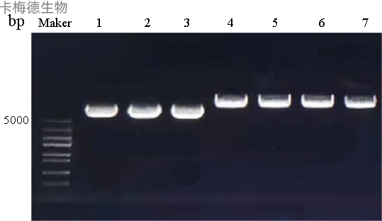線性化酵母前后跑對比電泳。切開后的條帶應(yīng)該跑的慢(4-7),完整質(zhì)粒跑在前面(1-3)。