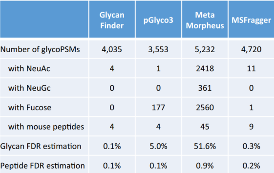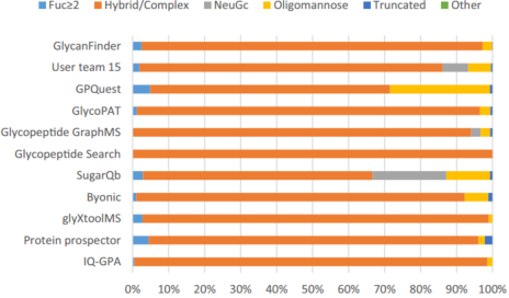 Kawahara等人最近描述了HUPO 人類糖蛋白組學計劃 (HGI)研究,評估來自9個開發(fā)團隊和13個用戶團隊的11個糖蛋白組學軟件的性能,以進行完整的糖肽分析。
