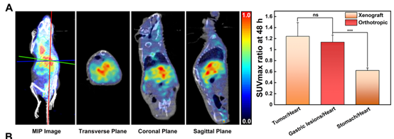 圖5 NIR-II引導(dǎo)下手術(shù)的研究。(A)攜帶BGC823cldn18.2的正交各向異性小鼠48h時124I-5G9的小動物PET/CT(左)。右圖為異種移植小鼠腫瘤/心臟、胃/心臟與正交異性小鼠胃病變/心臟的SUVmax比值比較。