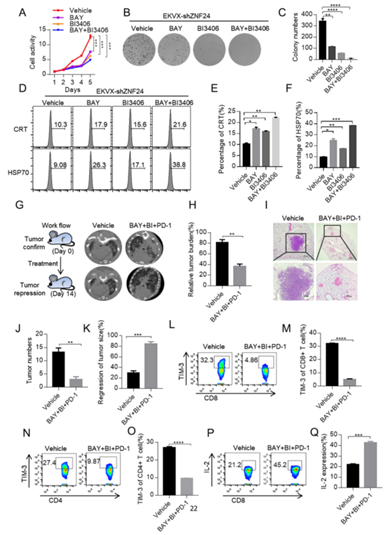 然后,作者生成了一組K-sgZNF24肺癌小鼠,如圖1M所示,并使用BAY11-7082、BI3406和抗小鼠PD-1抗體治療這些小鼠2周(Fig.5G). Micro-CT顯示肺腫瘤幾乎完全消退(圖G, H)。