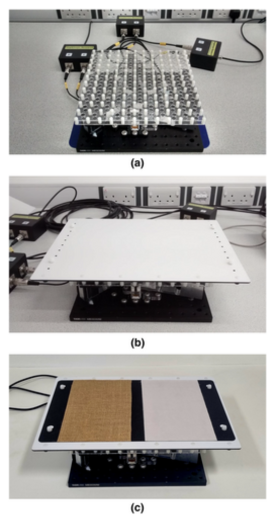 刺激包括從先前研究中選擇的兩種紋理:粗麻布和絲綢(下圖 )。刺激物的尺寸為150×255毫米,并使用雙面膠帶安裝到410×255毫米的紙樣品支架上。樣品以縱向安裝,Silk安裝在左側(cè),Hessian安裝在右側(cè),每側(cè)有40毫米的空間,樣品之間有30毫米的空間。隨后,將樣品支架連接到固定在霍普金森研究六軸傳感器上的 A3 尺寸(420 × 300 × 3 毫米)鋁復(fù)合板 (ACP),見(jiàn)下圖。