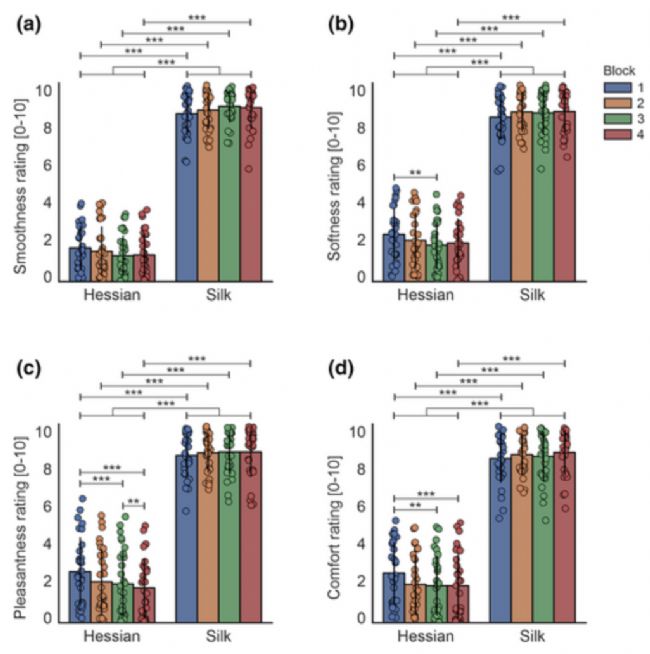 結(jié)果每種紋理的平均主觀評(píng)級(jí)如下圖所示。2 × 4 方差分析表示紋理對(duì)舒適度評(píng)級(jí)的主效應(yīng)具有統(tǒng)計(jì)學(xué)意義。