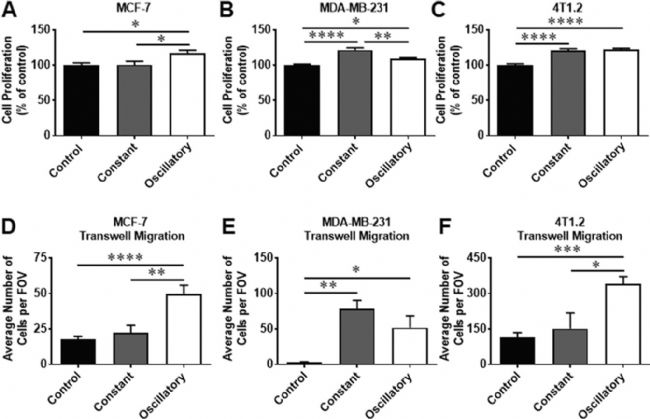 首先,為了確定體外機(jī)械應(yīng)變是否調(diào)節(jié)BCa細(xì)胞的增殖,利用體外張力系統(tǒng),參數(shù)為0.3 Hz,10%單軸振蕩應(yīng)變(Oscillatory strain,OS) 48小時(shí),10% 恒定應(yīng)變(Constant strain,CS)48小時(shí),或無應(yīng)變48小時(shí),然后將MCF-7細(xì)胞(人ER+),MDA-MB-231細(xì)胞(人TNBC)和4T1.2細(xì)胞(小鼠TNBC)暴露于恒定或振蕩應(yīng)變,并評(píng)估細(xì)胞增殖。結(jié)果表明,暴露于OS的MCF-7細(xì)胞與對(duì)照細(xì)胞或CS細(xì)胞相比增殖增加(圖1 a)。與對(duì)照細(xì)胞相比,暴露于CS和OS下的MDA-MB-231和4T1.2細(xì)胞的增殖都有所增加(圖1 b-c);暴露于OS增強(qiáng)了ER+和TNBC(人和小鼠)細(xì)胞的遷移潛力(圖1 d-f);暴露于CS僅增加人TNBC細(xì)胞的Transwell遷移和傷口愈合(圖1 e)。這些數(shù)據(jù)表明,振蕩應(yīng)變促進(jìn)ER+和TNBC細(xì)胞的增殖和遷移。