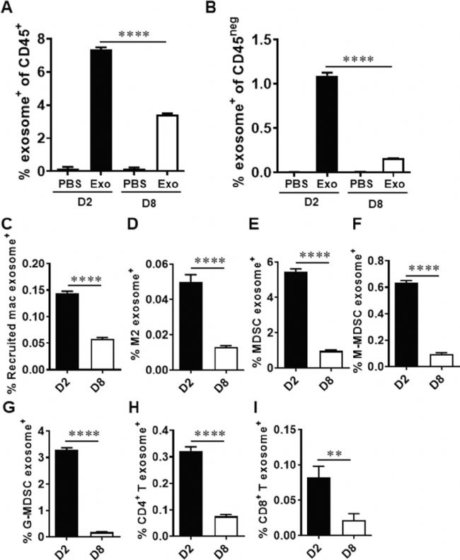 最后研究了TEXs是否被TME中的免疫細(xì)胞和腫瘤細(xì)胞內(nèi)化。在注射外泌體后的第2天(圖3 a)和第8天(圖3 a),TME中免疫細(xì)胞內(nèi)化的外泌體被鑒定為PKH67+ CD45+ 細(xì)胞,而腫瘤細(xì)胞內(nèi)化的外泌體被鑒定為PKH67+ CD45 陰性細(xì)胞(圖3 b)。此外,在外泌體注射后第2天和第8天,在TME中檢測(cè)到各種免疫細(xì)胞的外泌體內(nèi)化,包括募集的巨噬細(xì)胞(圖3 c)、M2巨噬細(xì)胞(圖3 d)、MDSCs(圖3 e-g)、 CD4+ T 細(xì)胞 (圖3 h)和CD8+ T細(xì)胞(圖3 i)。在外泌體+ 細(xì)胞中,MDSCs的頻率高于其他研究的免疫細(xì)胞群。這些結(jié)果表明,TEXs可以被TME中的免疫細(xì)胞和腫瘤細(xì)胞在體內(nèi)內(nèi)化。