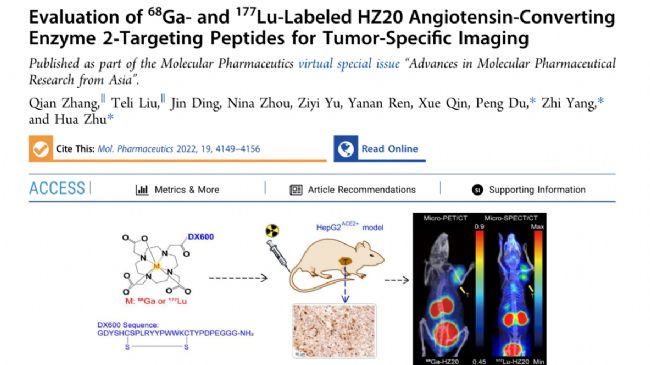 血管緊張素轉(zhuǎn)換酶2 (ACE2)與腫瘤形成密切相關(guān)。作者開發(fā)了放射標記肽對68Ga/177Lu標記1,4,7,10-四氮雜環(huán)十二烷-1,4,7,10-四乙酸(DOTA)偶聯(lián)DX600 (68Ga/177Lu-HZ20),用于靶向和定位ACE2過表達腫瘤。Ga/177Lu-HZ20采用常規(guī)標記法制備。采用HepG2ACE2+/HepG2WT細胞株評價68Ga/177Lu-HZ20的特異性。進行了藥代動力學、生物分布、微PET/CT和-SPECT/CT成像,并估計了輻射劑量。采用免疫組化(IHC)染色檢測腫瘤組織中ACE2的表達。68Ga/177Lu-HZ20的放射標記率分別為88.49±8.57% (n > 10)和84.71±9.75% (n > 10),比活性分別為(18.74±3.72)× 106和(17.85±1.62)× 106 GBq/mol。68Ga/177Lu-HZ20對KM小鼠HepG2ACE2+/ HepG2WT細胞攝取和快速清除有顯著差異。此外,HepG2ACE2+腫瘤在68Ga/177Lu-HZ20 Micro PET/SPECT圖像中清晰可見;贛icro-PET/CT,注射后30 min HepG2ACE2+腫瘤的標準攝取值(SUVmax)為0.66±0.02,IHC證實了HepG2ACE2+腫瘤中ACE2的高表達。在PET/CT圖像中,志愿者1的SUVmean高于相同病變的18F-FDG值。68Ga/177Lu-HZ20在ACE2過表達的腫瘤中被高效特異性攝取。它們可以作為成對探針用于ACE2靶向治療。
