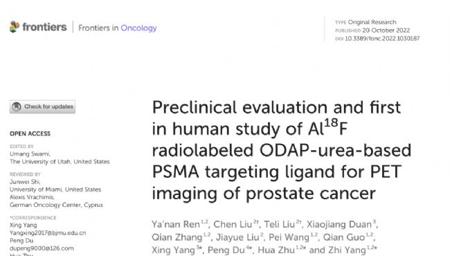 近日,貴州大學醫(yī)學院、北京大學第一醫(yī)院核醫(yī)學科、北京大學腫瘤醫(yī)院泌尿外科、北京大學腫瘤醫(yī)院暨北京市腫瘤防治研究所、核醫(yī)學科,國家藥監(jiān)局放射性藥物研究與評價重點實驗室,惡性腫瘤發(fā)病機制及轉化研究教育部重點實驗室團隊合作的研究成果Preclinical evaluation and first in human study of Al18F radiolabeled ODAP-urea-based PSMA targeting ligand for PET imaging of prostate cancer(Al18F放射標記的ODAP -尿素基PSMA靶向配體用于前列腺癌PET成像的臨床前評估和首次人體研究)在學術期刊Frontiers in Oncology發(fā)表。平生公司的小動物PET/CT(型號:Super Nova) 產品在論文中提供了重要的腫瘤小鼠PET/CT圖像和定量分析。