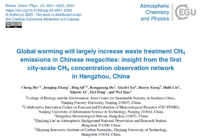 大氣中的甲烷是導(dǎo)致全球變暖的第二大人為因素。然而,從城市到全國尺度,其排放量、成分、時(shí)空變化等在很大程度上仍不確定。廢物處理(包括固體廢物填埋場、固體廢物焚燒和污水)產(chǎn)生的CH4排放占城市人為CH4總排放量的50%以上,考慮到CH4排放因子(EFs)對基于生物過程的源(如廢物處理)的高溫敏感性,在不同全球變暖情景下估算未來CH4排放量時(shí)會(huì)出現(xiàn)較大差異。此外,溫度與廢物處理CH4排放之間的關(guān)系僅在少數(shù)特定地點(diǎn)進(jìn)行了研究,缺乏整個(gè)城市的代表性。上述因素導(dǎo)致城市尺度CH4排放(尤其是來自廢物處理)的評估存在不確定性,并且預(yù)測的變化仍未得到探索。本文通過杭州塔基CH4觀測網(wǎng)絡(luò)進(jìn)行了全球變暖下廢物處理CH4排放的相關(guān)研究。