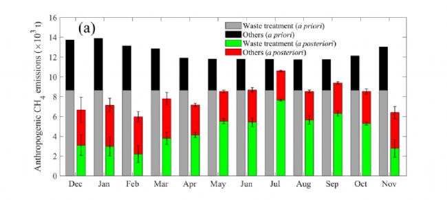 1、模擬的CH4濃度存在明顯的季節(jié)性偏差,主要是年和月尺度廢物處理偏差所致。反演后的CH4排放呈現(xiàn)出明顯的季節(jié)變化,夏峰冬谷,主要是廢物處理的貢獻(xiàn);