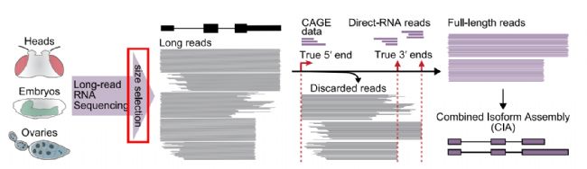 本研究中,結(jié)合Sage Science公司BluePippin全自動DNA片段回收儀,開發(fā)了一個研究策略Combined Isoform Assembly(CIA)來準(zhǔn)確評估和量化長或者超長mRNA異構(gòu)體,顯著提升mRNA亞型發(fā)掘效率和質(zhì)量(圖1)。以果蠅大腦組織(具有豐富的mRNA多樣性以及超長mRNA)為例,使用BluePippin富集>3kb的DNA片段,顯著提升read長度(圖2),從而提升read的完整轉(zhuǎn)錄本覆蓋率(圖3、4)。