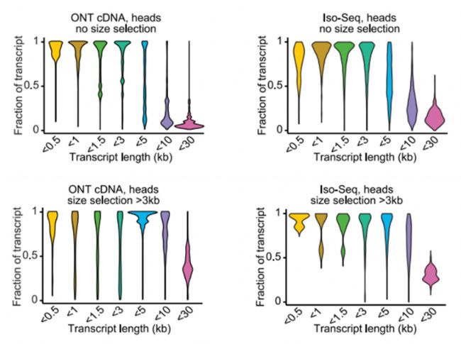 圖4. 在片段篩選之前(上圖)和之后(下圖),果蠅頭部的納米孔測序cDNA和PacBio Iso-seq的每個read的全長轉(zhuǎn)錄本覆蓋率,篩選后有顯著提升(對于每個read,顯示所覆蓋的目標(biāo)轉(zhuǎn)錄本的分?jǐn)?shù);根據(jù)目標(biāo)轉(zhuǎn)錄本的長度對讀數(shù)進(jìn)行分組)