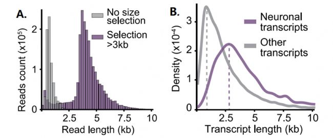 圖2. 使用BluePippin 進(jìn)行片段選擇后顯著增加了ONT cDNA的read長度(A),并優(yōu)化了神經(jīng)元轉(zhuǎn)錄本的回收,其長度(B)超過了沒有進(jìn)行片段選擇的LRS實(shí)驗(yàn)的覆蓋范圍(灰色)