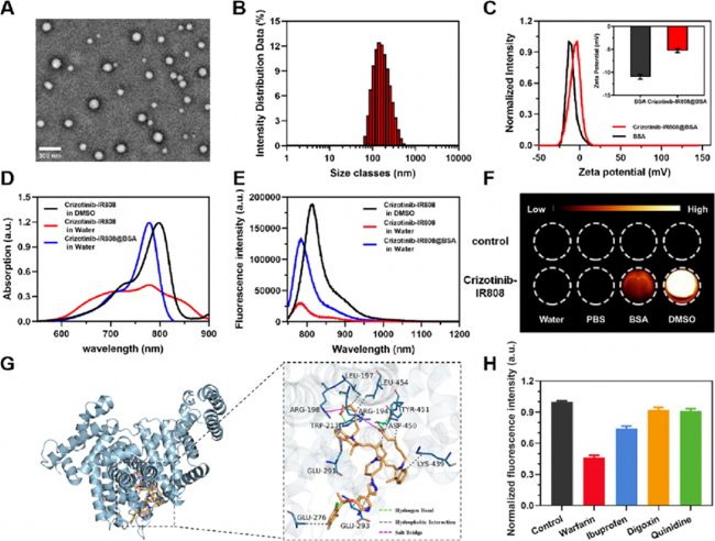 圖1. Crizotinib-IR808@BSA的特性 (A) TEM圖像 (B)流體動力學(xué)粒徑和(C)ζ電勢。(D) Crizotinib -IR808和Crizotinib -IR808@BSA的吸收光譜和(E)近紅外熒光發(fā)射光譜(6μm)。(F)在不同溶劑中的NIR-II熒光圖像。(G) Crizotinib-IR808與BSA的分子對接(PDB ID: 6QS9)。(H)Crizotinib-IR808在含有白蛋白結(jié)合位點(diǎn)I、II、III和α1-羥基脂肪蛋白抑制劑的BSA水溶液中的歸一化發(fā)射強(qiáng)度。