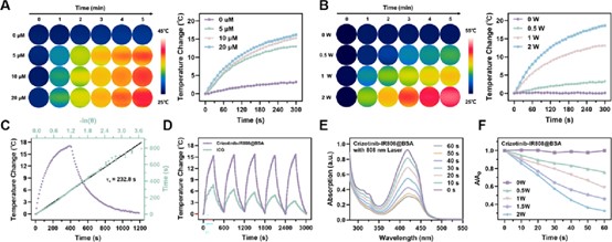 圖2. 體外光熱效應(yīng)和ROS生成 (A)不同梯度濃度和(B)不同輻照強(qiáng)度下的實(shí)時(shí)紅外熱像圖和溫度變化曲線。(C)光熱轉(zhuǎn)換效率 (D)光熱穩(wěn)定性。(E)用Crizotinib-IR808@BSA進(jìn)行DPBF預(yù)培養(yǎng)的吸收光譜。(F)在DMSO中用不同輻射強(qiáng)度的Crizotinib-IR808@BSA進(jìn)行DPBF預(yù)培養(yǎng)的相對吸光度。
