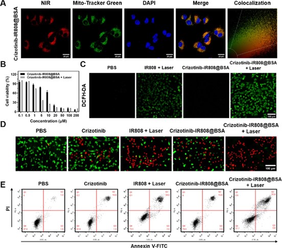 圖3. 體外協(xié)同抗腫瘤作用 (A) CT26 細(xì)胞中Crizotinib-IR808@BSA 與 Mito-Tracker Green的共聚焦顯微圖像。(B) 使用或不使用激光照射的情況下,用Crizotinib-IR808@BSA處理CT26細(xì)胞24 h的存活率。CT26細(xì)胞在不同處理組中的(C) DCFH-DA染色熒光圖像、(D)Calcein AM/PI 染色熒光圖像和(E)膜聯(lián)蛋白V-FITC/PI分析。