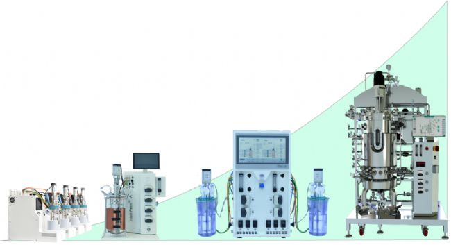 對(duì)于早期的實(shí)驗(yàn)室研發(fā)、工藝開發(fā)及優(yōu)化和臨床樣品制備,通常使用規(guī)模較小的生物反應(yīng)器(0.5-20L),但將生物反應(yīng)器從早期研發(fā)的小體積轉(zhuǎn)移到商業(yè)化規(guī)模生產(chǎn)中所使用的大體積(圖1),保證工藝的放大可行性是連接實(shí)驗(yàn)研發(fā)和商業(yè)生產(chǎn)之間的關(guān)鍵環(huán)節(jié)之一。因此,選擇合適的放大策略則是工藝開發(fā)人員面臨的重要挑戰(zhàn)。