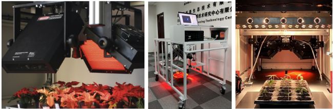 自左至右依次為:FluorCam模塊式葉綠素熒光成像系統(tǒng)(配備有紅外熱成像模塊)、FluorCam-IQ移動式葉綠素熒光與高光譜成像系統(tǒng)、PhenoTron-PTS植物表型成像分析系統(tǒng)(配備有葉綠素熒光成像、多光譜熒光成像、RGB成像及高光譜成像分析模塊)