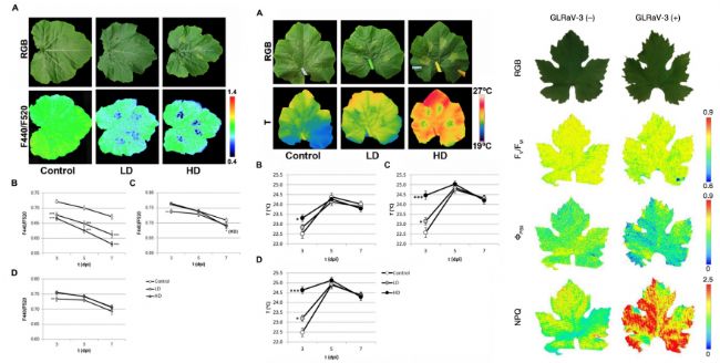 左圖與中圖:西葫蘆病害感染多光譜熒光成像與紅外熱成像檢測;右圖:葡萄卷葉病毒葉綠素熒光成像檢測