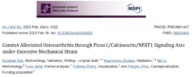 最近,在武漢大學人民醫(yī)院骨外科、中南醫(yī)院關節(jié)與運動醫(yī)學科的一項研究中,闡明了過度機械應變加重OA的潛在機制,研究結果表明,Piezo1是軟骨細胞中響應機械信號的基本分子,并通過CaN / NFAT1信號軸調節(jié)細胞凋亡和軟骨基質代謝,并且Gsmtx4可能是針對OA治療的有吸引力的藥物。相關內容發(fā)表在 International Journal of Molecular Sciences 題為“Gsmtx4 Alleviated Osteoarthritis through Piezo1/Calcineurin/NFAT1 Signaling Axis under Excessive Mechanical Strain”。