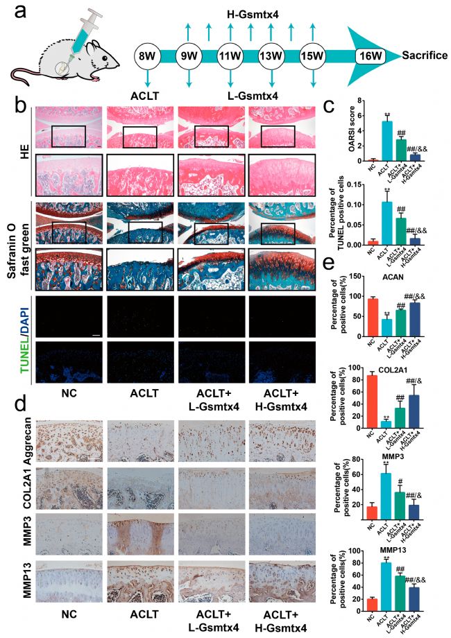 最后,研究人員試圖研究通過關節(jié)內注射Gsmtx4阻斷Piezo1 / CaN / NFAT1信號軸對ACLT-誘導的OA大鼠的影響。實驗以兩種不同的頻率進行注射(H-Gsmtx4組每周一次,L-Gsmtx4組每兩周一次)(圖3 a)。結果顯示,術后8周ACLT組關節(jié)軟骨表面糜爛和蛋白聚糖丟失。與ACLT組相比,ACLT+L-Gsmtx4組和ACLT+H-Gsmtx4組關節(jié)軟骨破壞程度較輕,尤其是后者(圖3 b)。與ACLT組相比,Gsmtx4處理組的OARSI評分明顯較低,ACLT+H-Gsmtx4組低于ACLT+L-Gsmtx4組。此外,Gsmtx4降低了軟骨細胞的凋亡比例,且呈劑量依賴性(圖3 c)。免疫組織化學染色結果顯示,Gsmtx4注射降低了ACLT誘導OA模型中MMP3和MMP13的表達,增加了COL2A1和聚集蛋白聚糖的表達(圖3 d)。其中,高頻率關節(jié)內注射Gsmtx4表現出較好的療效。這些數據表明,Gsmtx4可以通過抑制細胞凋亡和合成代謝/分解代謝失衡來改善大鼠的OA。