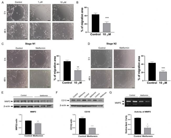為了研究二甲雙胍是否可以抑制人PSCs的遷移能力,進(jìn)行了細(xì)胞遷移測定。與對照和1 μM二甲雙胍相比,10 μM二甲雙胍顯著抑制細(xì)胞遷移形成的圓形無細(xì)胞區(qū)的封閉(圖1 A、B)。這些結(jié)果在不同N期PDAC患者的PSCs中是可重復(fù)的(圖1 C、D)。此外,研究了MMP2的蛋白質(zhì)表達(dá)和酶活性。在不同N期PDAC患者的PSCs中,MMP2蛋白水平和酶活性在對照組和二甲雙胍組之間存在顯著差異(圖1 E、G)。二甲雙胍對CD10的蛋白質(zhì)表達(dá)具有抑制作用,CD10是一種促進(jìn)癌細(xì)胞進(jìn)展的基質(zhì)干細(xì)胞標(biāo)志物(圖1 F)。這些數(shù)據(jù)表明,二甲雙胍可以抑制人類PSCs的遷移能力和MMP2和CD10的表達(dá)水平。