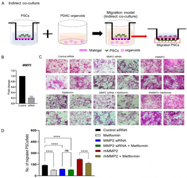 最近,在韓國成均館大學(xué)醫(yī)學(xué)院三星醫(yī)學(xué)中心內(nèi)分泌與代謝系、肝膽胰腺外科系以及大邱慶北醫(yī)療創(chuàng)新基金會的一項聯(lián)合研究中,著手確定了二甲雙胍在臨床相關(guān)濃度下的抗癌作用是否可以在由患者來源的PDAC類器官和從術(shù)后組織獲得的原代人PSCs制成的PDAC三維(3D)共培養(yǎng)模型中得到證明。利用該模型,實驗探索了二甲雙胍對PSCs的抗遷移作用的關(guān)鍵機(jī)制是否是由MMP2下調(diào),以及口服二甲雙胍(30 mg/kg)是否可以抑制免疫抑制小鼠PDAC類器官異種移植的生長。相關(guān)內(nèi)容發(fā)表在 The American Journal of Cancer Research 期刊題為“Anti-cancer effects of metformin in a 3D co-culture model of pancreatic ductal adenocarcinoma”。
