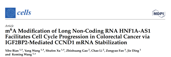 南京醫(yī)科大學(xué)附屬第二醫(yī)院腫瘤科王科明團(tuán)隊在cells上發(fā)表了文章m6A Modification of Long Non-Coding RNA HNF1A-AS1 Facilitates Cell Cycle Progression in Colorectal Cancer viaIGF2BP2-Mediated CCND1 mRNA Stabilization。本研究發(fā)現(xiàn)HNF1A-AS1通過形成HNF1A-AS1/miR-93-5p/AGO2復(fù)合體吸附miR-93-5p進(jìn)而上調(diào)CCND1,并通過METTL3誘導(dǎo)的m6A修飾穩(wěn)定CCND1 mRNA。