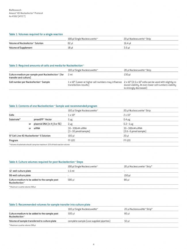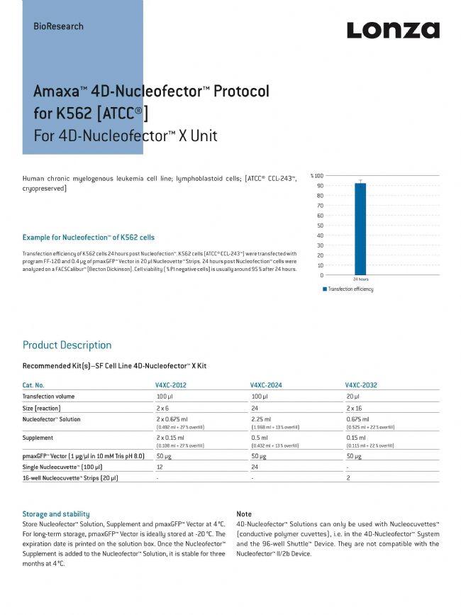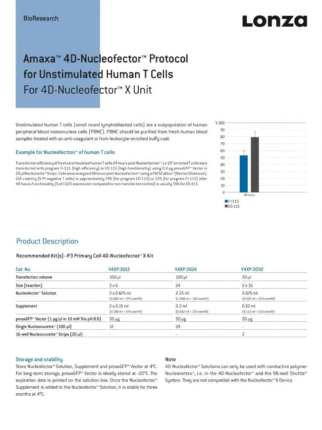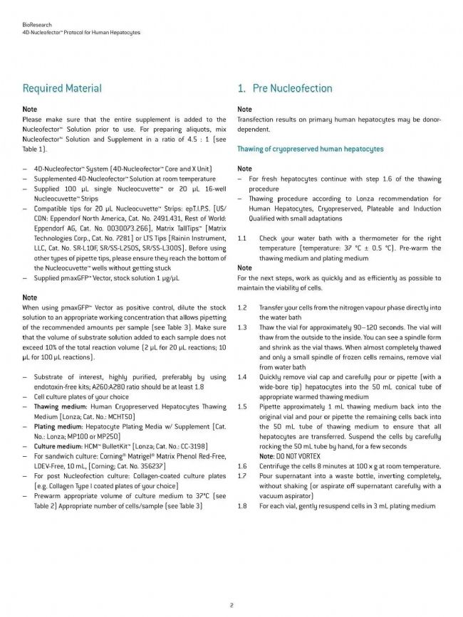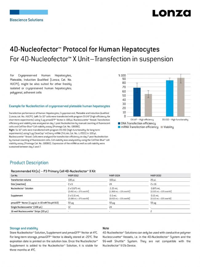*所有Protocol是Lonza使用Lonza原代細胞產(chǎn)品/官方來源的細胞系及試劑盒中配套的pmaxGFP質粒獲得的數(shù)據(jù)