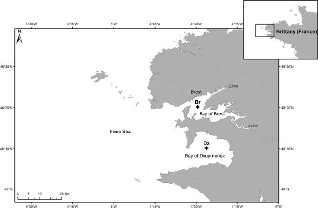 圖1 布列塔尼(法國)布列斯特灣(Br)和杜阿爾內(nèi)灣(Dz)采樣點的位置。