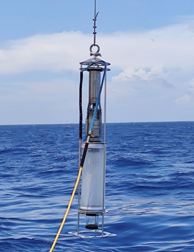 每小時在3個不同深度(1.5-3m,10-12m和17-26m,分別對應表面、溫躍層和近底水層)采集棘皮動物幼體樣品,使用可潛入水中的浮游生物泵(圖2)進行采樣。本次研究使用的浮游生物泵來自KC Denmark A/S公司,型號為23.570,由泵和收集器兩部分組成。泵由不銹鋼制成,流量為300L/min。本研究采用80μm網(wǎng)目,可以收集所有目標物種的所有幼體階段。采集的樣品使用96%乙醇保存,以待后續(xù)分析。此外,使用ADCP、CTD、PAR等設備,并結(jié)合三維水動力模型MARS,研究了采樣區(qū)域的局部流體動力學。