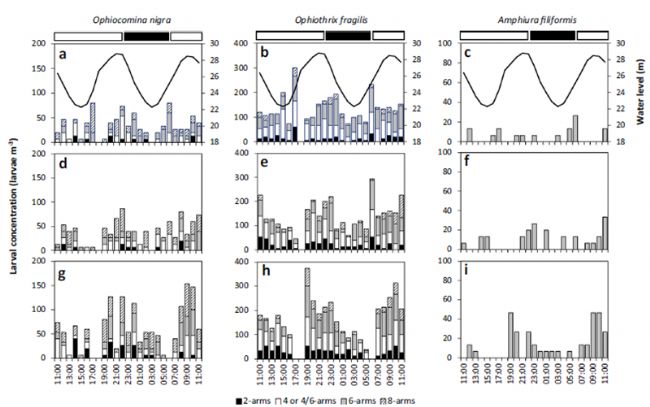 本文在兩個對比鮮明的水動力環(huán)境中,研究了蛇尾類幼體的垂直分布情況,并發(fā)現(xiàn)在布雷斯特灣,由于強烈的垂直混合作用,所有幼體都均勻分布在水柱中;相反,杜阿爾內(nèi)灣,觀察到海蛇尾幼體的晝夜垂直遷移現(xiàn)象,幼體在夜間上升到水表。兩個海灣中的這些不同模式證實了潮流對幼體通量的影響。