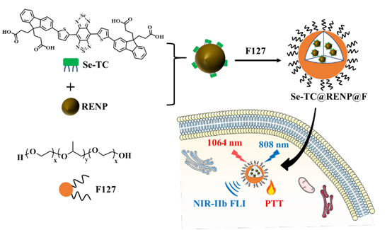 本文首先合成了具有供體-受體-供體(D-A-D)型結構的羧基官能化有機小分子(Se-TC),設計并成功制備了具有顯著NIR-IIb發(fā)射的多層稀土納米粒子(RENP)。然后,通過Se-TC和RENP之間的配位以及隨后的F127封裝,構建了水溶性有機-無機混合納米光療診斷劑。