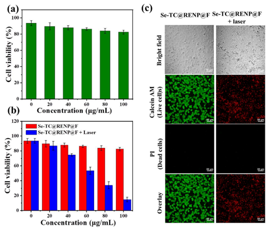 圖4. (a)通過MTT測試 Se-TC@RENP@F 的生物相容性。通過(b) MTT 和 (c) 活/死細胞染色法評估 Se-TC@RENP@F 在1064納米激光照射下的處理效果