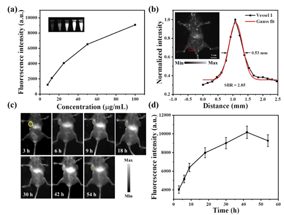 圖5. (a)不同濃度下Se-TC@RENP@F的NIR-IIb熒光強度和NIR-IIb亮度。(b)所選容器的半高全寬和SBR的測定。(插圖:Se-TC@RENP@F注射后5分鐘的NIR-II血管造影術)(c)基于Se-TC@RENP@F的小鼠在不同時間點的NIR-IIb FLI(黃色圓圈代表腫瘤面積)。(d)腫瘤區(qū)域在不同時間點的NIR-IIb信號強度。