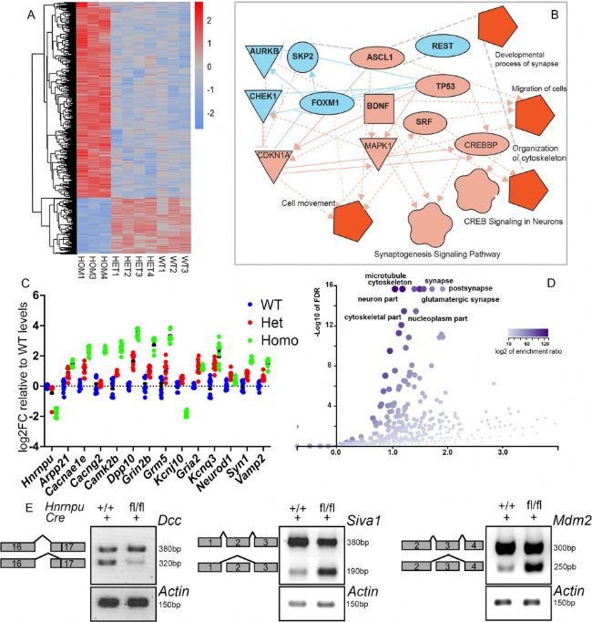 圖3:Hnrnpu突變體皮層顯示了對大腦發(fā)育和功能至關(guān)重要的基因的mRNA表達(dá)和選擇性剪接的變化