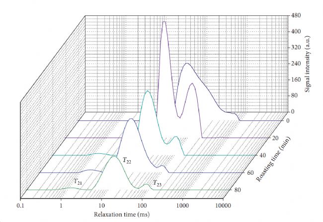 陜西理工大學(xué)的金文剛團隊在大鯢的食品加工方面進(jìn)行了新型的探索,實驗探討焙燒工藝對大鯢肉干在焙燒過程中品質(zhì)特性及水分流動性的影響,在實驗過程中,使用低場核磁共振(FSMag)進(jìn)行T2橫向弛豫試驗,得到了T2弛豫反演譜圖。