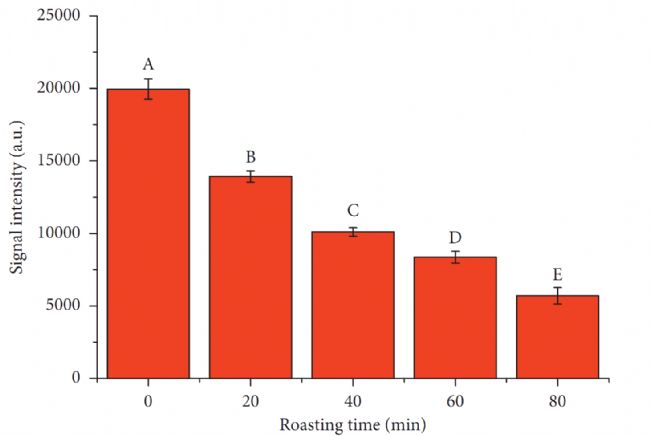 結(jié)果表明,在40 ~ 60 min的烘烤時間內(nèi),大鯢肉干的整體可接受性得分較高。此時肉干含有大量的健康不飽和脂肪酸,適合作為營養(yǎng)型大鯢肉干生產(chǎn)時間的參考,同時LF-NMR和MRI可以作為一種快速、無損的分析工具來描述焙燒過程中的品質(zhì)特征。