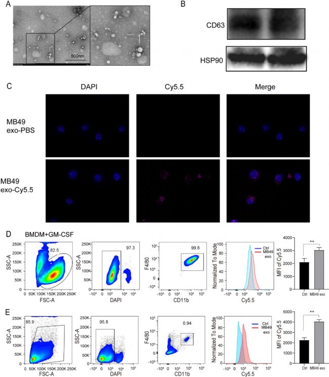 然后研究了MB49細胞CM中的外泌體是否可以介導巨噬細胞M2極化。通過電子顯微鏡觀察外泌體形態(tài)(圖1 A),并檢測了外泌體標志物HSP90和CD63的表達(圖1 A)。為了研究巨噬細胞是否可以攝取MB49衍生的外泌體,將BMDM與Cy5.5標記的外泌體進行共培養(yǎng)。免疫熒光和流式細胞分析表明,MB49來源的外泌體可以被巨噬細胞攝。▓D1 C、D)。進而通過將Cy5.5標記的MB49衍生外泌體注射到小鼠體內(nèi)研究了膀胱巨噬細胞中外泌體富集和吸收的可能性。結果顯示,膀胱F4/80+ CD11b+ 巨噬細胞中Cy5.5的平均熒光強度遠高于對照組(圖1 E);谏鲜鼋Y果,可以確認源自MB49細胞的外泌體可以在體外和體內(nèi)被巨噬細胞攝取。