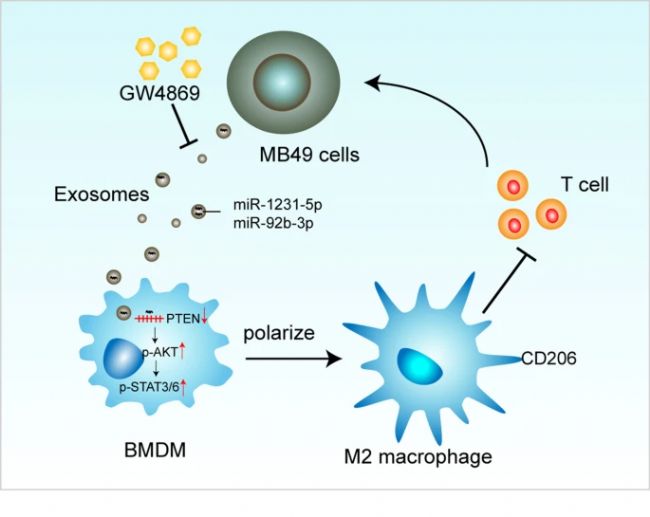 基于上述結果,發(fā)現(xiàn)MB49來源的外泌體miRNAs可以通過激活PTEN/AKT/STAT3/6通路誘導巨噬細胞極化為免疫抑制表型,從而有助于建立免疫抑制TME以促進腫瘤生長。